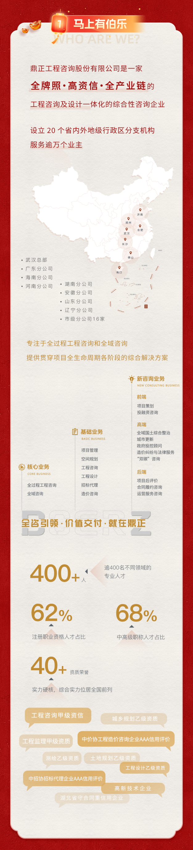 業(yè)績(jī)涉及各類(lèi)公建、工業(yè)、能源、環(huán)保、交通、市政、城市軌道、國(guó)土整治等行業(yè),包括海內(nèi)外各類(lèi)建設(shè)項(xiàng)目的工程咨詢(xún)、工程招標(biāo)代理、工程造價(jià)咨詢(xún)、項(xiàng)目管理等咨詢(xún)業(yè)務(wù)...
